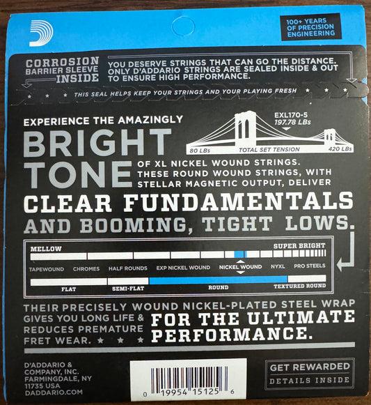 D'Addario XL Nickel Wound Strings for 5-STRING BASS 45-100 EXL170-5