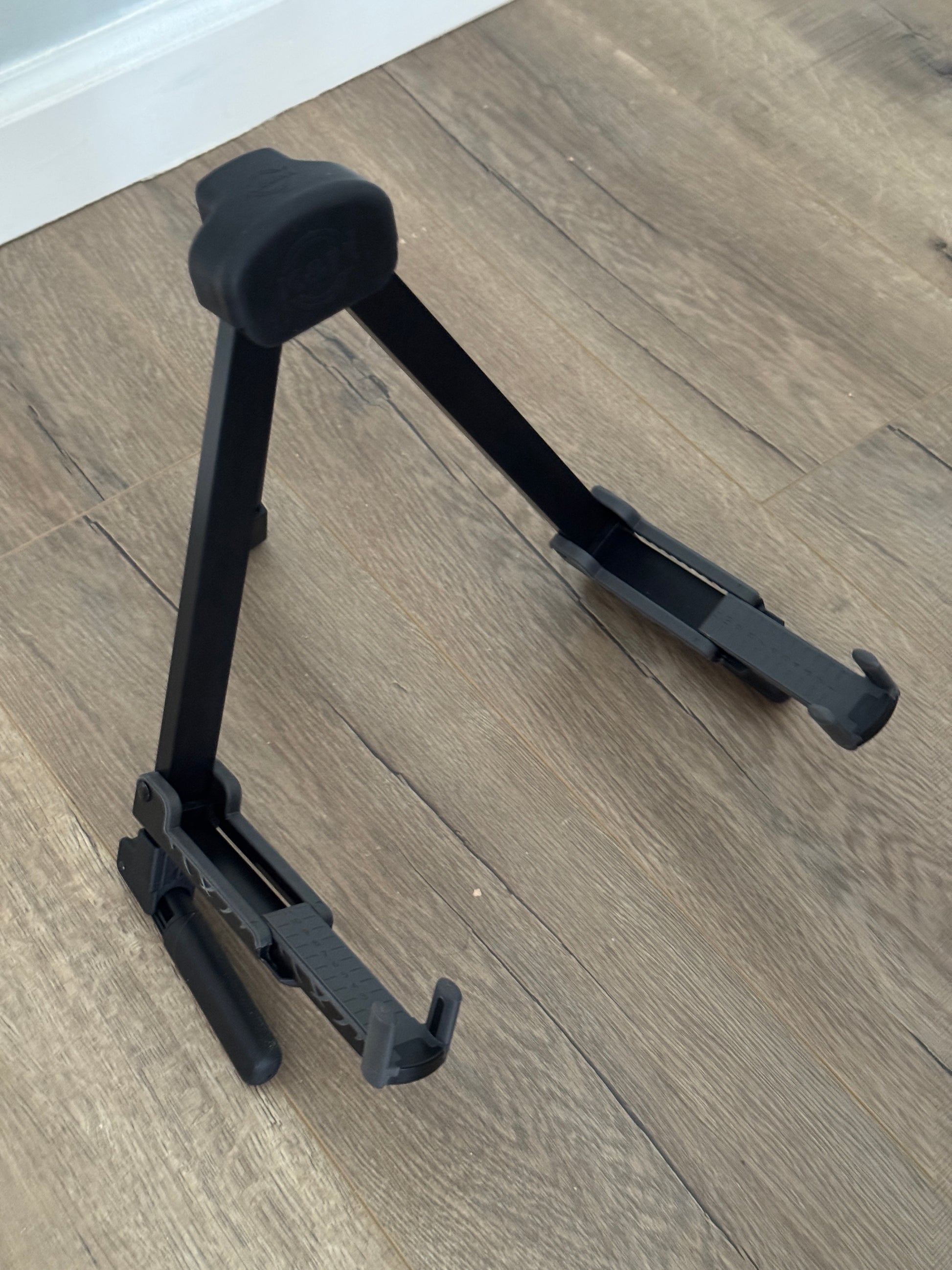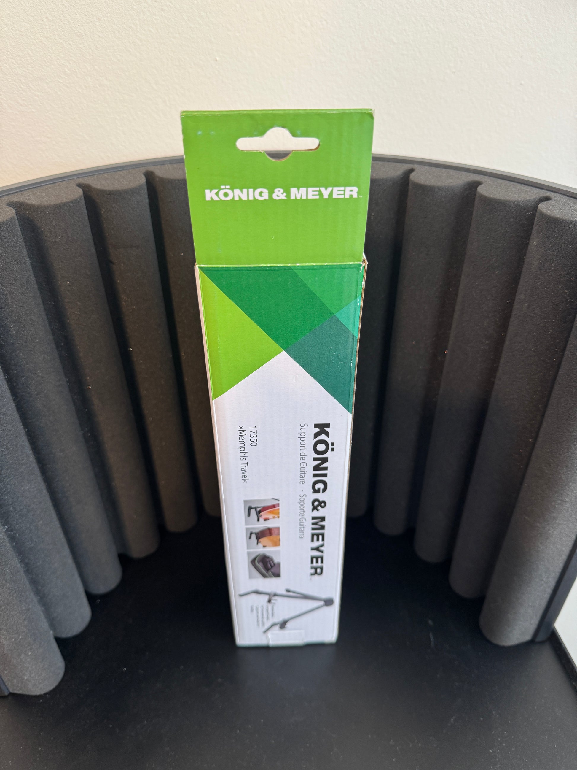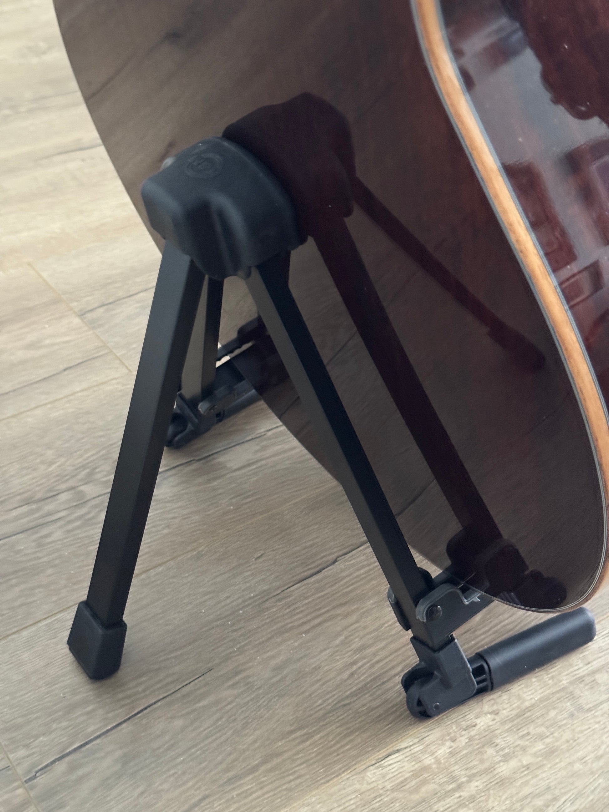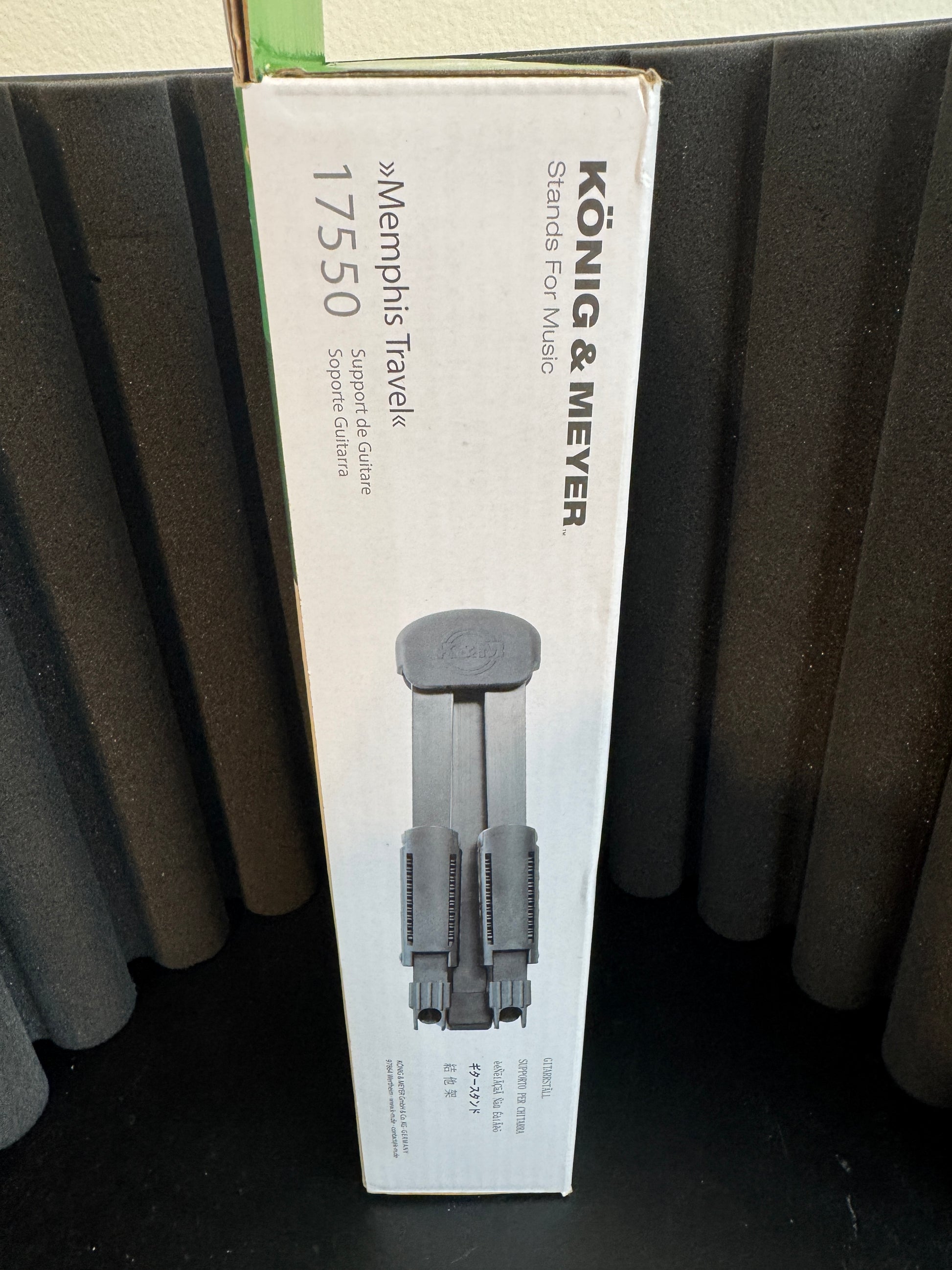 The Konig & Meyer Memphis Travel Stand is great for electric or acoustic guitars. It's durable, foldable, portable, and adjustable. It's a light weight aluminum stand that can be collapsed to fit into almost any gig bag. The support arms are covered with soft plastic to protect your instrument's finish.