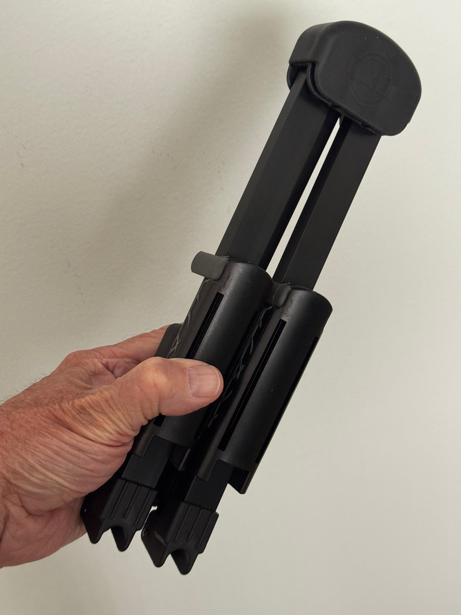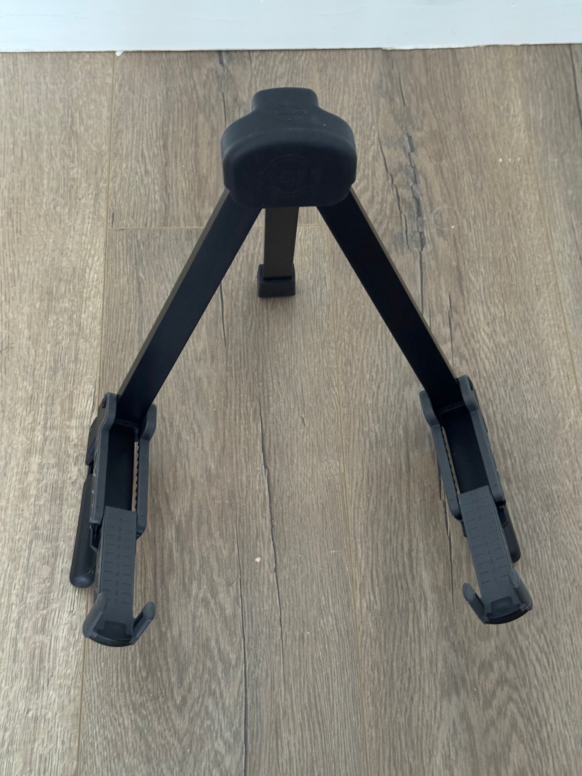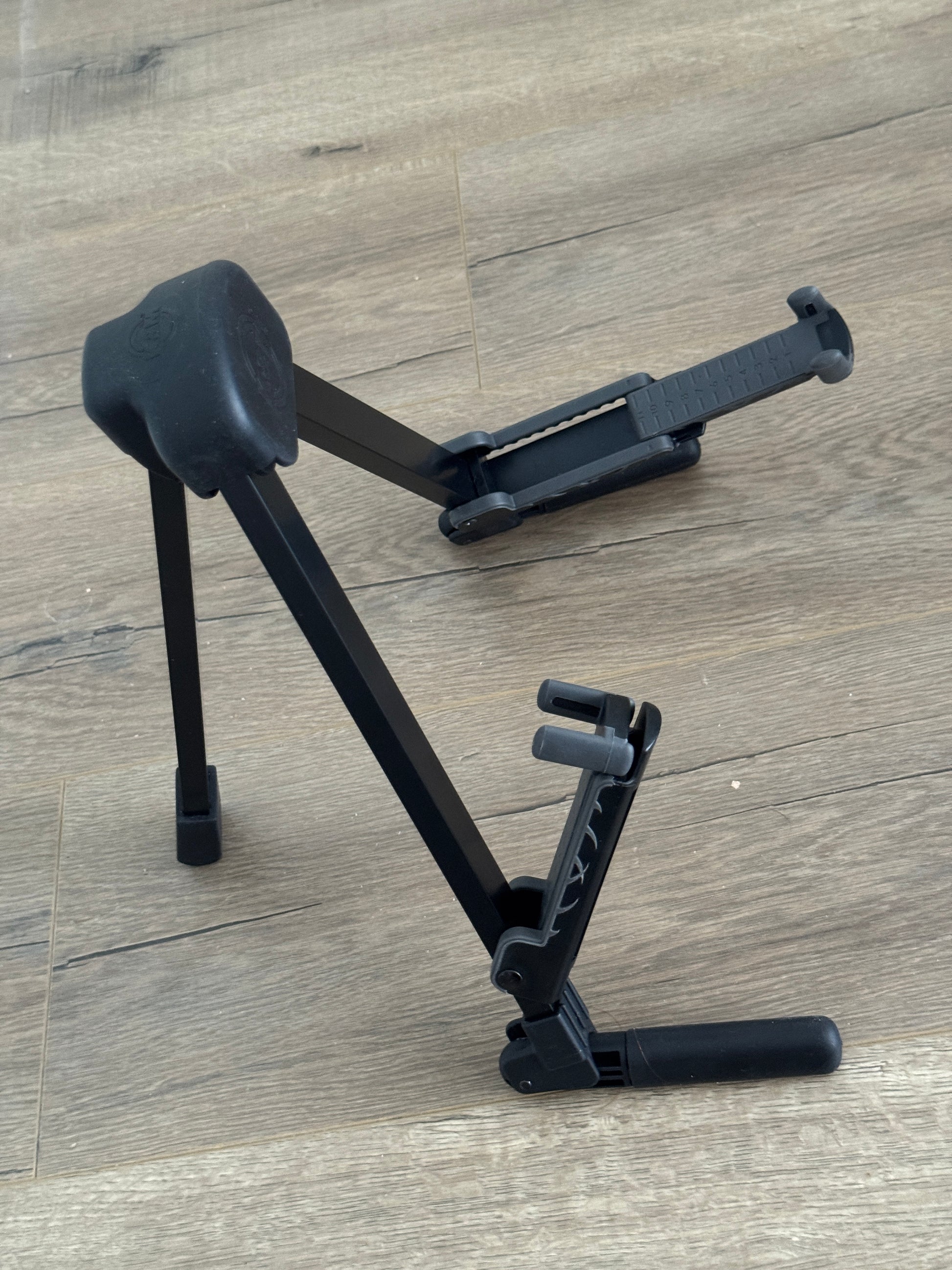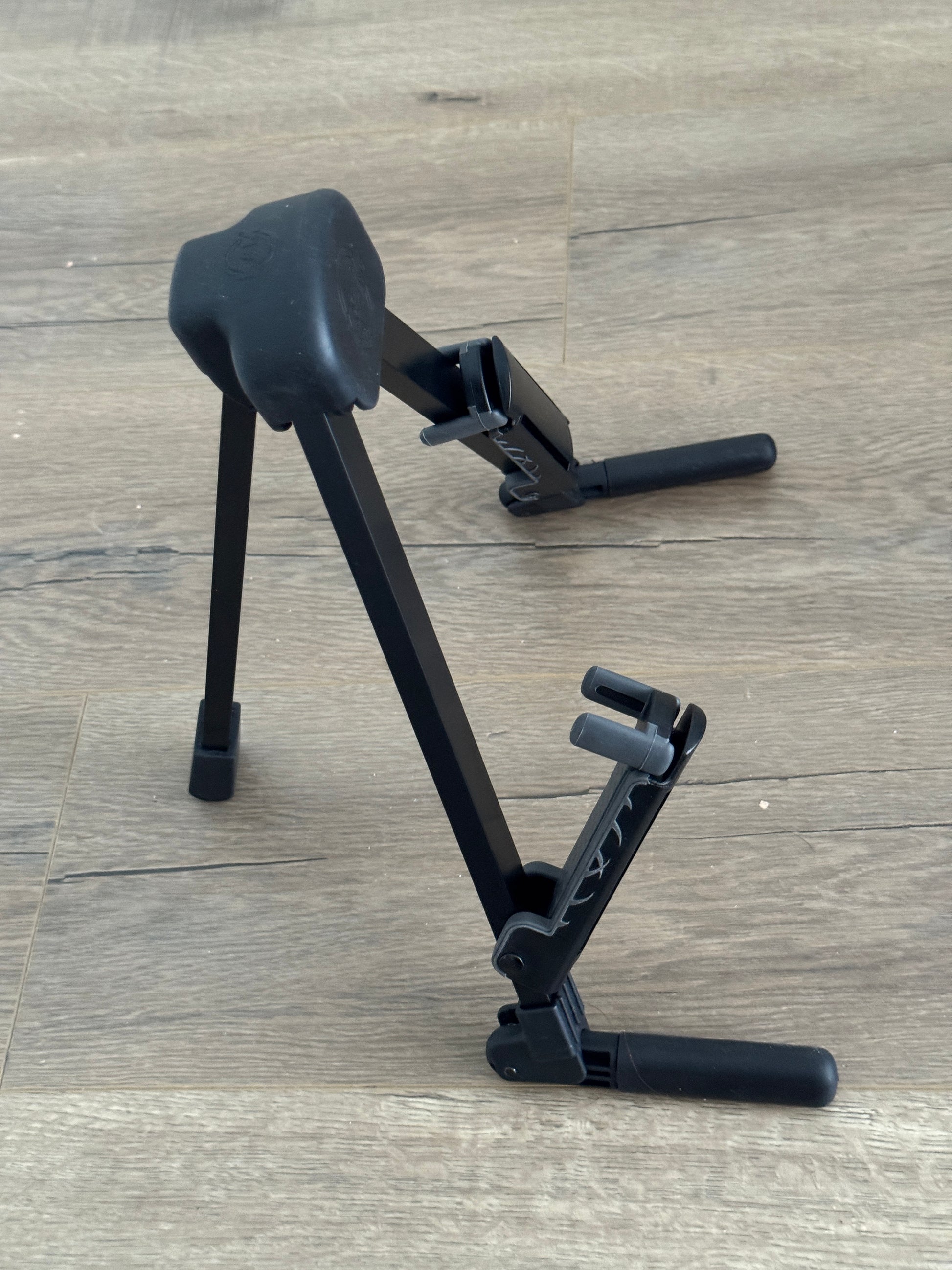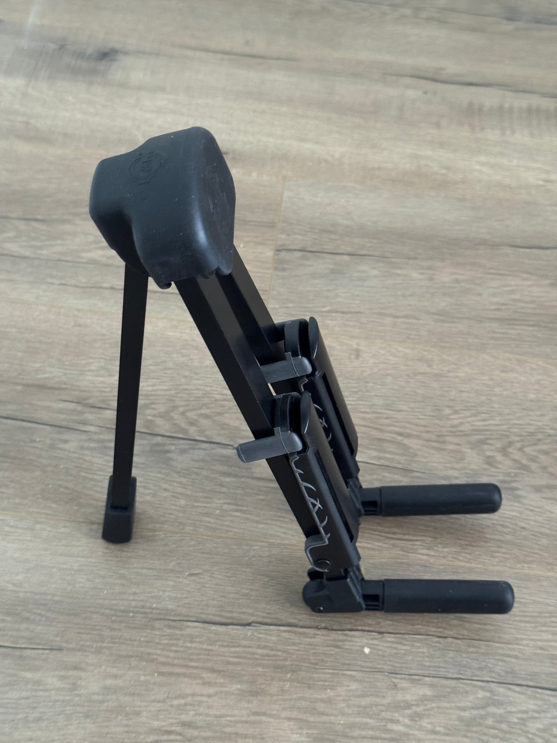 The Konig & Meyer Memphis Travel Stand is great for electric or acoustic guitars. It's durable, foldable, portable, and adjustable. It's a light weight aluminum stand that can be collapsed to fit into almost any gig bag. The support arms are covered with soft plastic to protect your instrument's finish.