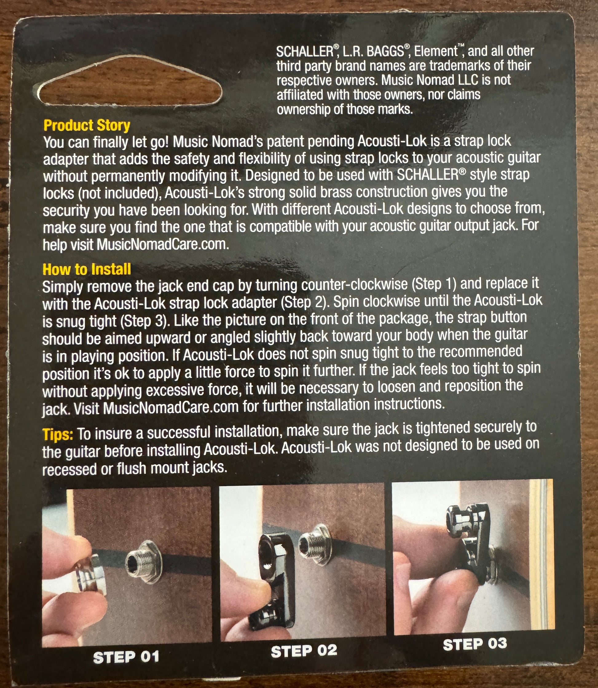 L.R. BAGGS®, Element™, SCHALLER®, K&K SOUND® and all other third party brand names are trademarks of their respective owners. Music Nomad LLC is not affiliated with those owners, nor claims ownership of those marks.