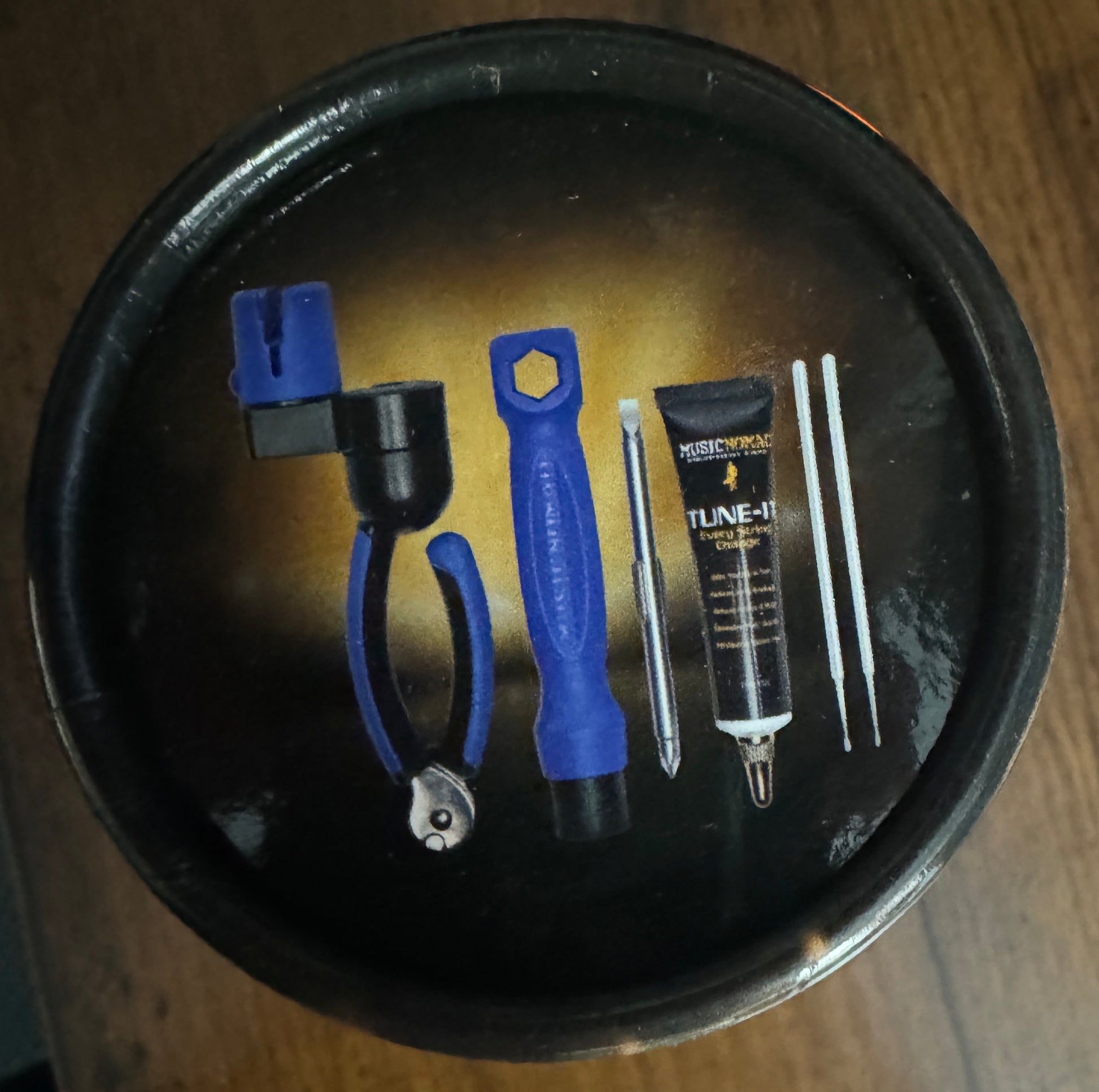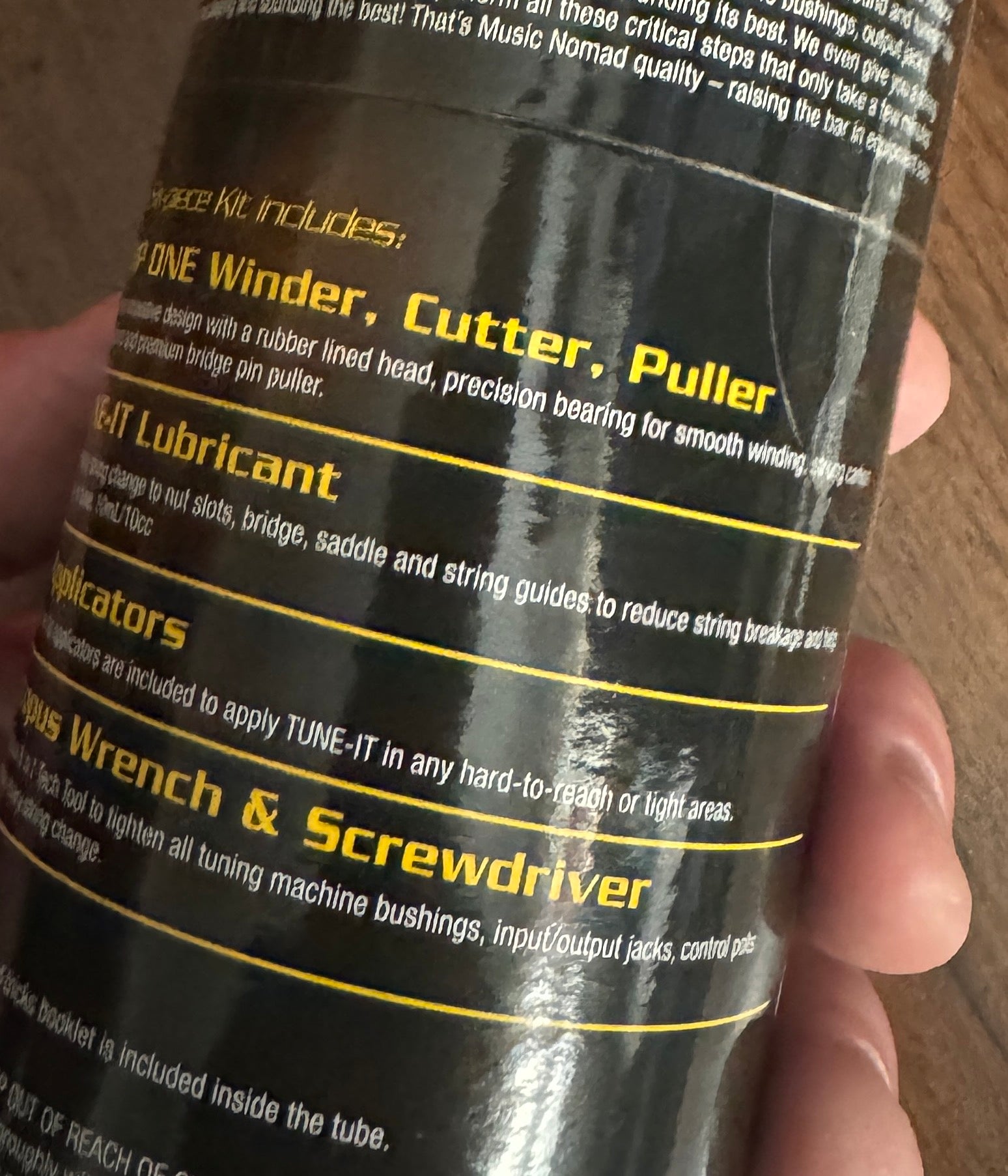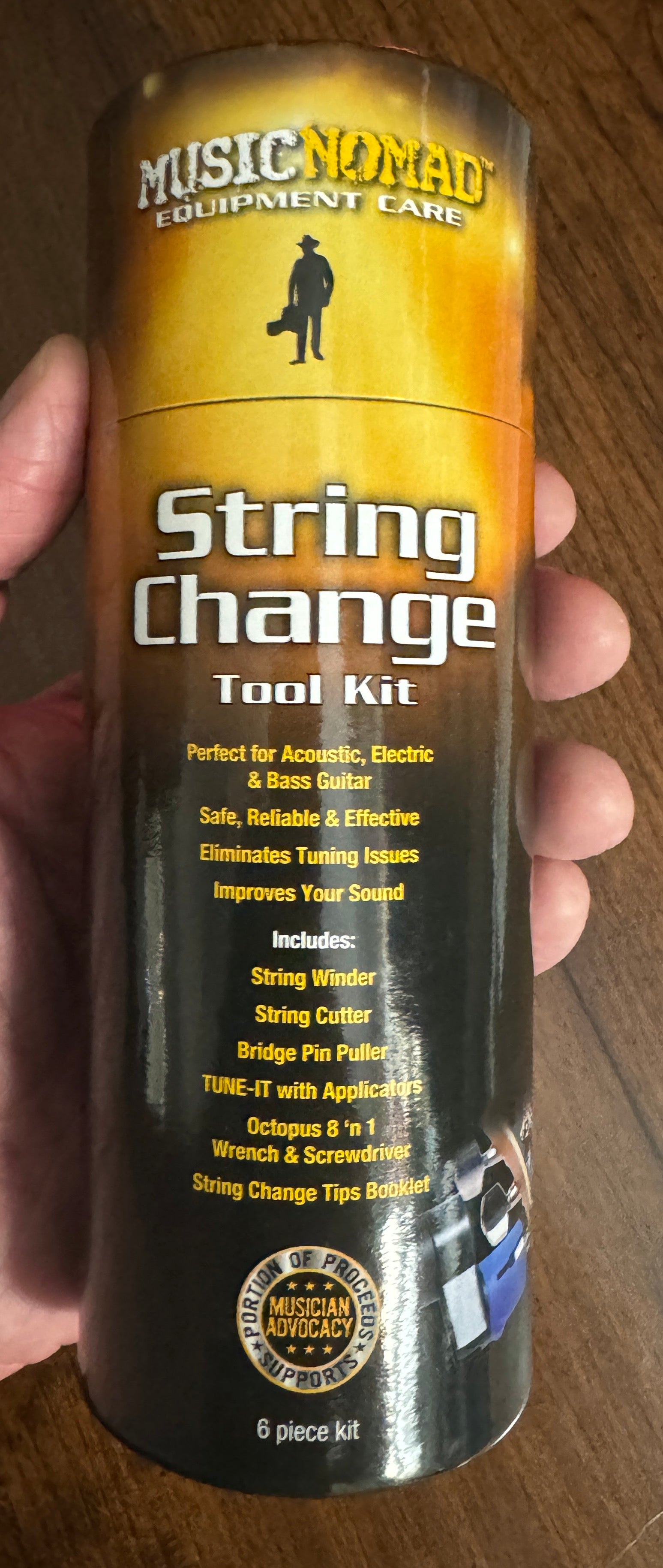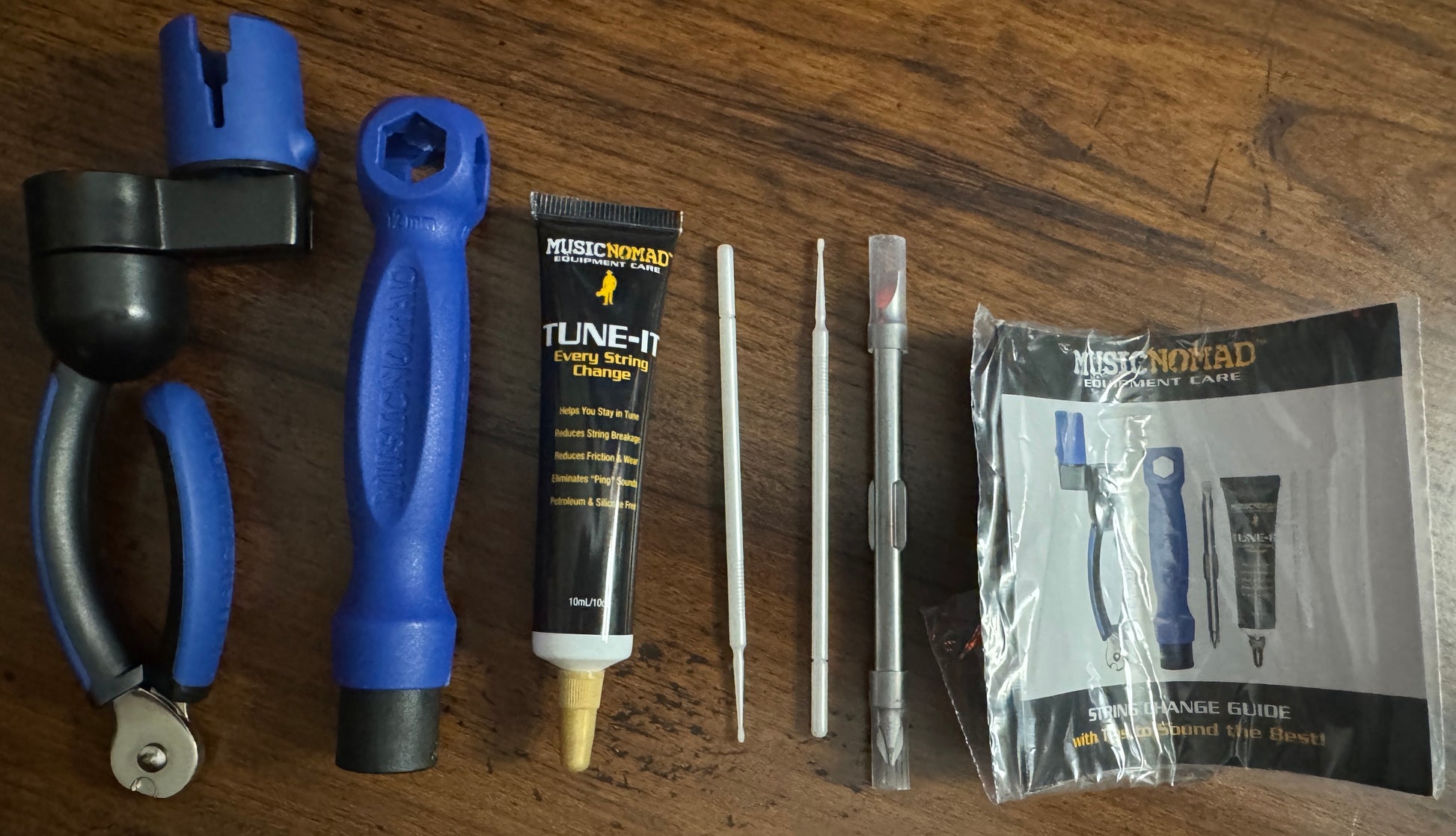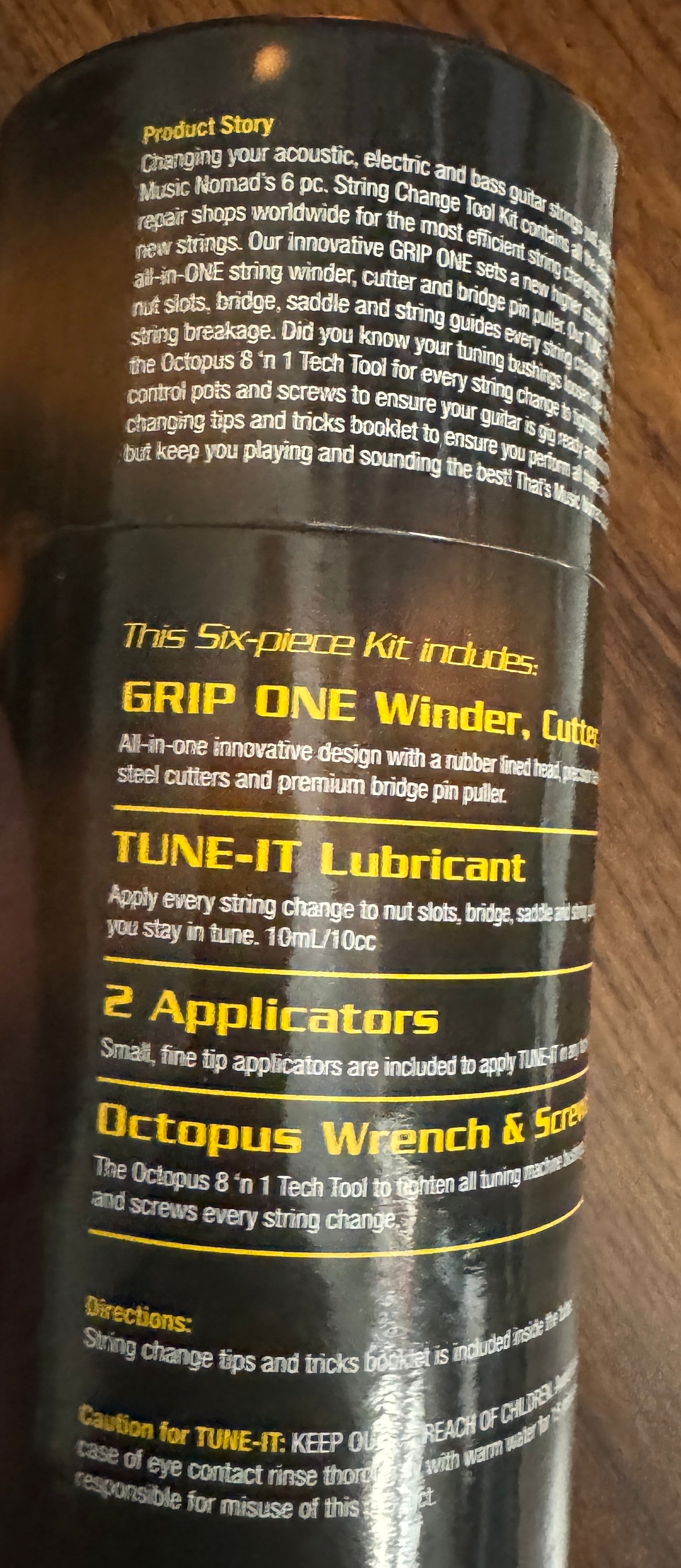 The 6 pc. String Change Tool Kit includes our: GRIP ONE, TUNE-IT, the Octopus 8 'n 1 Tech Tool, & a 12 page instructional booklet all in a convenient storage tube.