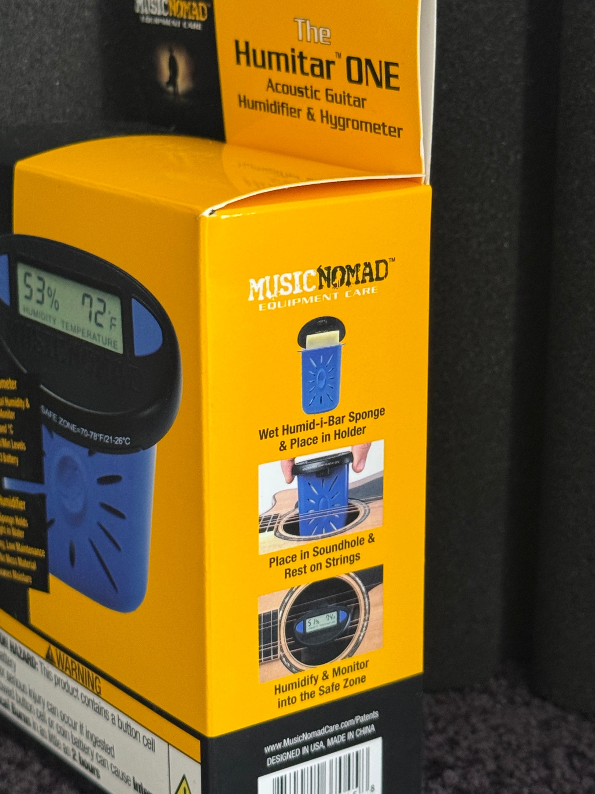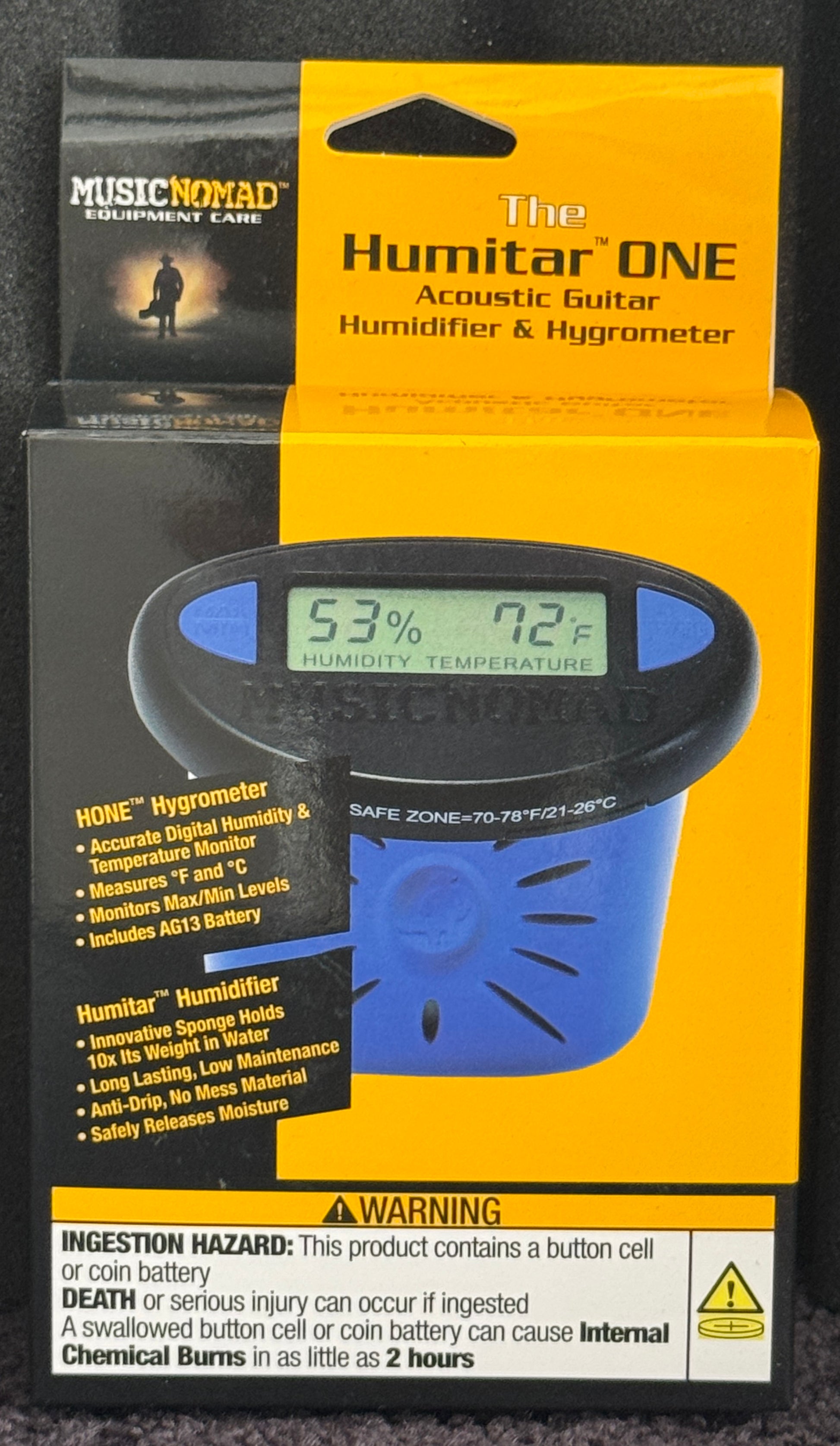 Keep your acoustic guitar in top playing condition with The Humitar ONE, the acoustic guitar humidifier and hygrometer by Music Nomad. Designed to maintain the proper level of humidity, this device prevents cracks and damage from dryness, ensuring your guitar stays protected and ready to play. The Humitar ONE is a must-have accessory for any guitarist serious about their instrument's care. Its compact design slides right into your guitar case, making it an ideal travel companion. With the convenience of a built-in hygrometer, you can easily monitor your guitar's humidity levels and make adjustments as needed for long-lasting instrument health.